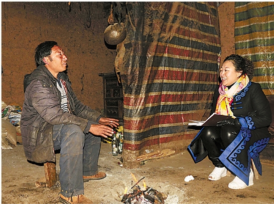 2月23日,全国人大代表潘成英(右)在四川省喜德县沙马拉达乡村民吉克瓦则家里调研。 新华社记者 周相吉 摄