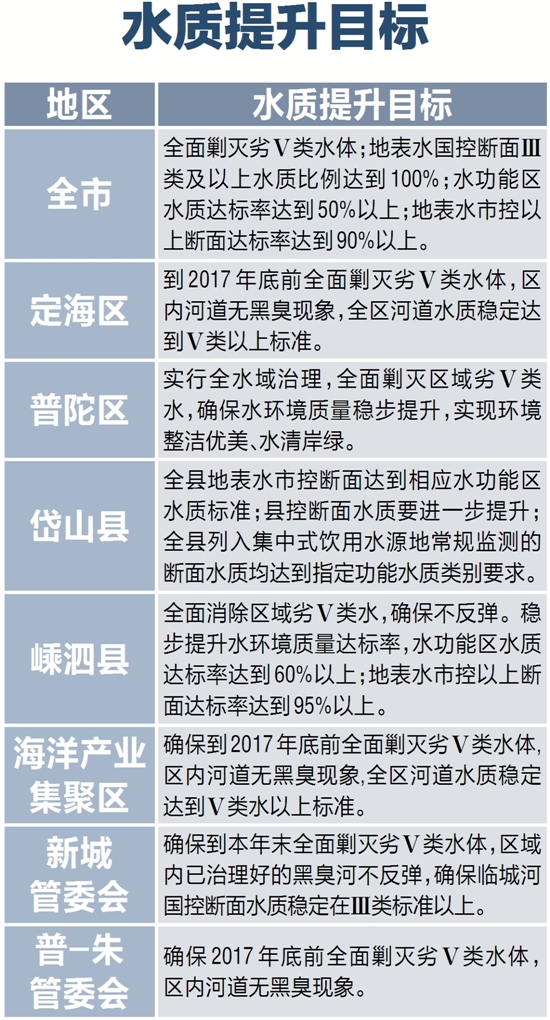| 定海区 | 到2017年底前全面剿灭劣Ⅴ类水体,区内河道无黑臭现象,全区河道水质稳定达到Ⅴ类以上标准。 |