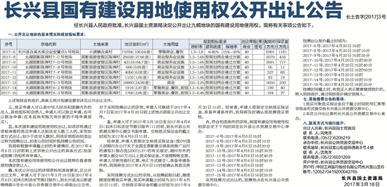 四、本次公开出让的详细资料和具体要求,见公开出让文件。申请人可于2017年3月18日至2017年4月6日(双休日和法定节假日除外),到长兴县龙山街道锦绣路8号长兴县公共资源交易中心获取出让文件。对于采用挂牌出让的宗地,申请人可继续于2017年4月7日至2017年4月20日到上述地点获取公开出让文件。
