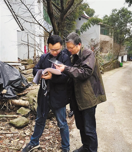 浙江省、湖州市两级国土资源部门工作人员在长兴县煤山三洲山村滑坡隐患点检查地质灾害防治工作。 钱龙 摄