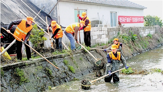 4月1日,湖州市吴兴区东林镇30余名河道保洁员,对东明村千亩田沟渠劣Ⅴ类小微水体进行打捞清淤、排污换水。 通讯员 沈娟 摄
