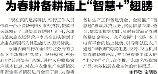 永康农商银行在金华银监分局的引领下创新推出“智慧+”服务模式,充分利用“普惠快车”系统,进村入户收集农户基本信息,对农户农业生产生活情况和资金需求情况进行全面了解,为春耕备耕生产工作备足资金。全面推广“普惠通”移动办贷业务,实现信息采集、查询、贷款审批等功能,及时有效满足春耕备耕资金需求。充分发挥“丰收购”本土电商平台的线上优势,引导和鼓励农户通过“丰收购”购买化肥、农药、农业机具等春耕备耕产品,并引导农业主体入驻“丰收购”平台,宣传推广永康名特优农产品,有效拓展农业主体的销售渠道。
