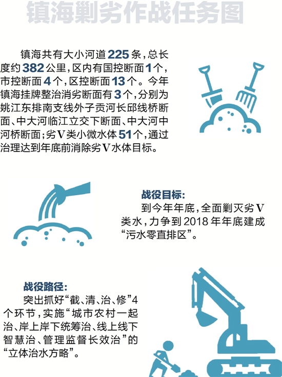 镇海共有大小河道225条,总长度约382公里,区内有国控断面1个,市控断面4个,区控断面13个。今年镇海挂牌整治消劣断面有3个,分别为姚江东排南支线外子贡河长邱线桥断面、中大河临江立交下断面、中大河中河桥断面;劣Ⅴ类小微水体51个,通过治理达到年底前消除劣Ⅴ水体目标。