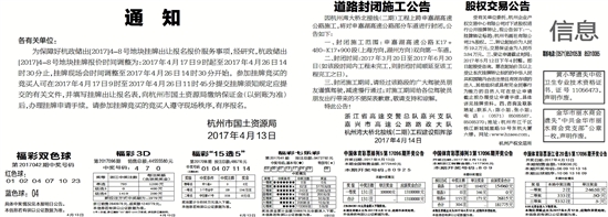 为保障好杭政储出[2017]4-8号地块挂牌出让报名报价服务事项,经研究,杭政储出[2017]4-8号地块挂牌报价时间调整为:2017年4月17日9时起至2017年4月26日14时30分止,挂牌现场会时间调整至2017年4月26日14时30分开始。参加挂牌竞买的竞买人可在2017年4月17日9时至2017年4月26日11时45分提交挂牌须知规定应提交的有关文件,并填写挂牌出让报名表,向杭州市国土资源局缴纳保证金(以到账为准)后,办理挂牌申请手续。请参加挂牌竞买的竞买人遵守现场秩序,有序报名。