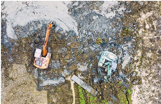 吴兴区渔业推进洁水工程和休闲渔业发展,两台工程车正在挖掘池塘淤泥。