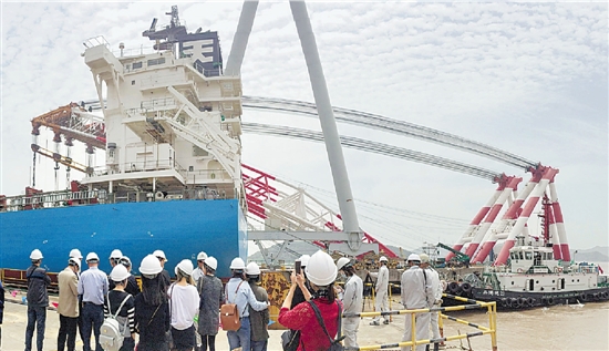 4月19日,舟山市岱山县秀山岛上的常石集团(舟山)造船有限公司迎来40位游客,这是秀山岛首次推出的工业游试点项目,也是舟山首个以船舶工业为主题的旅游项目。图为游客们正在参观新船出坞场景。 通讯员 赵嘉波 林威威 记者 林上军 摄 |