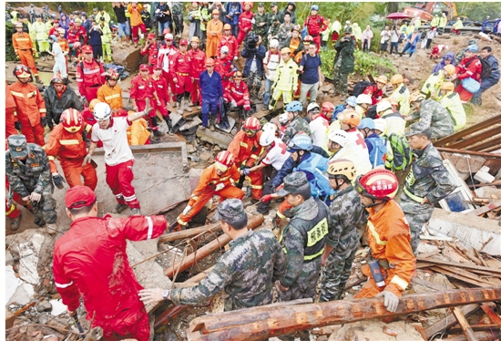 2016年9月,遂昌苏村发生山体滑坡,全省18支红十字救援队赶赴救援。图为救援人员正在全力搜救被困人员。