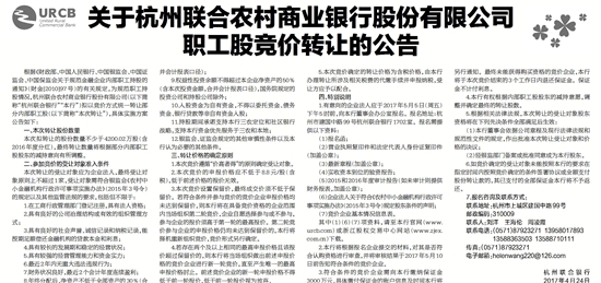 根据《财政部、中国人民银行、中国银监会、中国证监会、中国保监会关于规范金融企业内部职工持股的通知》(财金[2010]97号)的有关规定,为规范职工持股情况,杭州联合农村商业银行股份有限公司(以下简称“杭州联合银行”“本行”)拟以竞价方式统一转让部分内部职工股(以下简称“本次转让”),具体实施方案公告如下: