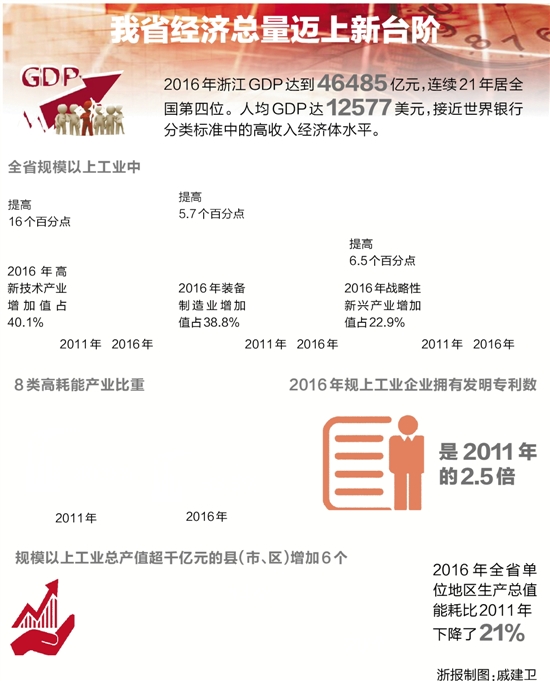 2016年浙江GDP达到46485亿元,连续21年居全国第四位。人均GDP达12577美元,接近世界银行分类标准中的高收入经济体水平。