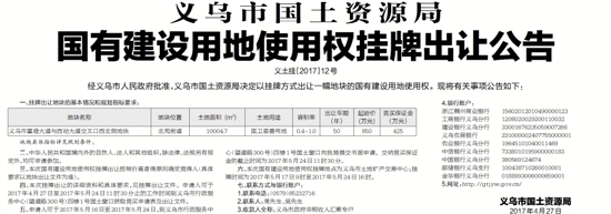 六、本次国有建设用地使用权挂牌地点为义乌市土地矿产交易中心;挂牌时间为2017年5月17日9时至2017年5月24日16时。