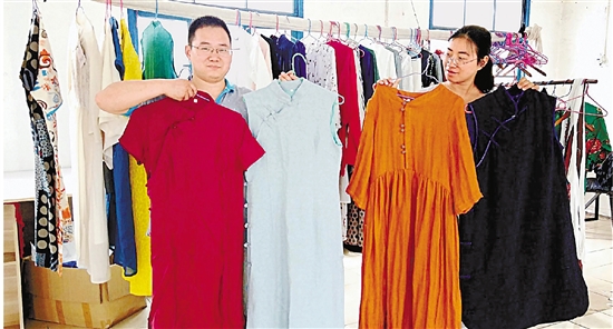 洪达太(左)和合作伙伴展示设计制作的中式女装。 陈健 摄