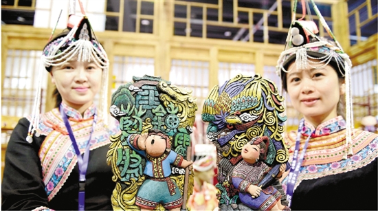 第12届中国(义乌)文交会现场,来自景宁畲族博物馆的参展人员展示“畲乡情话”陶艺品。 (吕斌 摄)