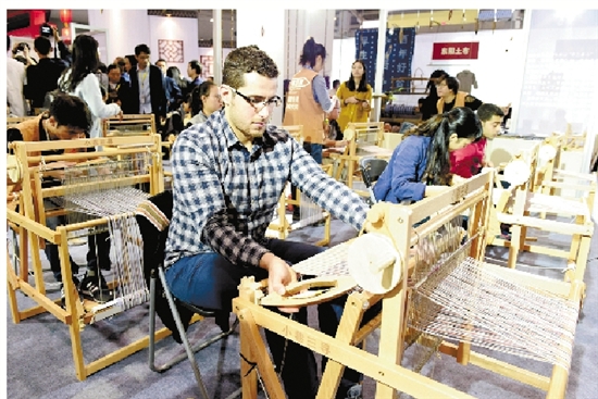 浙江非遗生活馆,外商在体验中国传统非遗手工织布。 (吕斌 摄)