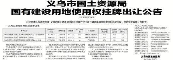 六、本次国有建设用地使用权挂牌地点为义乌市土地矿产交易中心;挂牌时间为2017年5月26日9∶00至2017年6月4日16∶00。