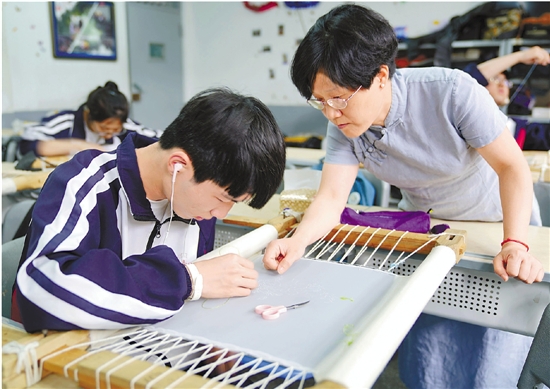 省工艺美术大师余知音在杭州市美术职业学校传授刺绣技艺。