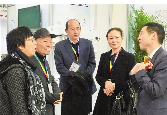 在2017年浙江省国际医疗器械博览会上,潘仁进向俞梦孙院士(左二)介绍“云胶片”及“全网云”影像工作平台。
