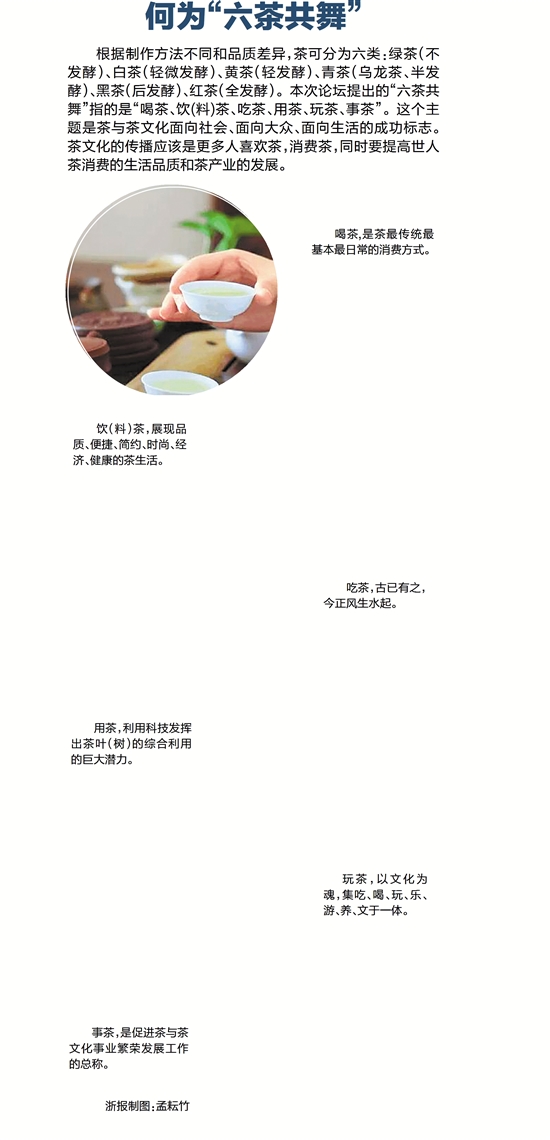 根据制作方法不同和品质差异,茶可分为六类:绿茶(不发酵)、白茶(轻微发酵)、黄茶(轻发酵)、青茶(乌龙茶、半发酵)、黑茶(后发酵)、红茶(全发酵)。本次论坛提出的“六茶共舞”指的是“喝茶、饮(料)茶、吃茶、用茶、玩茶、事茶”。这个主题是茶与茶文化面向社会、面向大众、面向生活的成功标志。茶文化的传播应该是更多人喜欢茶,消费茶,同时要提高世人茶消费的生活品质和茶产业的发展。
