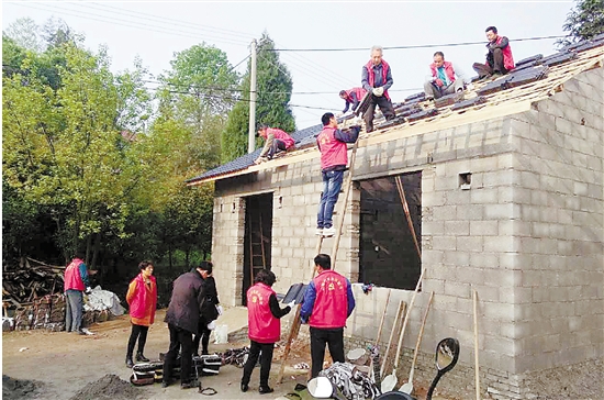 山峰村党员志愿者帮助低保户进行危房改造。(资料照片)