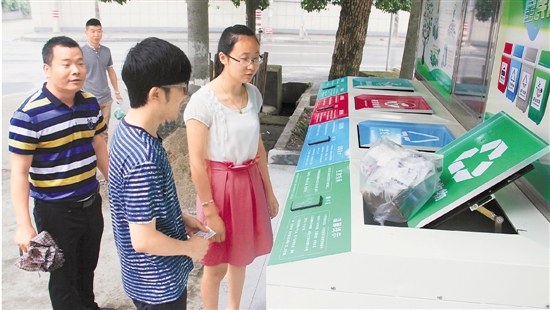 | 5月23日上午,桐庐县富春江镇黄坡岭社区内,一名工作人员指导社区居民刷卡丢垃圾。居民只要在分类投放生活垃圾时,刷一刷身份证或者市民卡、银行卡等有关身份识别的信息卡,就能获得相应积分,积分可以换取日用品或生活优惠服务。 拍友 徐军勇 摄 |