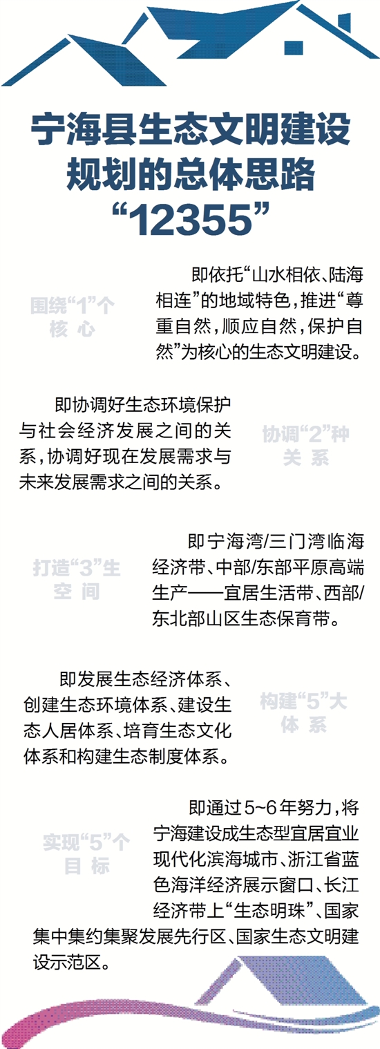 即通过5~6年努力,将宁海建设成生态型宜居宜业现代化滨海城市、浙江省蓝色海洋经济展示窗口、长江经济带上“生态明珠”、国家集中集约集聚发展先行区、国家生态文明建设示范区。