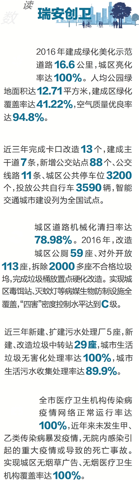 城区道路机械化清扫率达78.98%。2016年,改造城区公厕59座、对外开放113座,拆除2000多座不合格垃圾坞,完成垃圾桶放置点硬化改造。实现城区毒饵站、灭蚊灯等病媒生物防制设施全覆盖,“四害”密度控制水平达到C级。