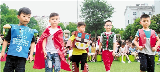 5月31日上午,在湖州市吴兴区埭溪镇中心幼儿园,一场环保科普时装秀精彩上演。孩子们穿着亲手制作的环保服装走秀,有的用一次性桌布制作了晚礼服,有的用彩色包装袋制作了纸裙,有的用彩色的垃圾袋、环保袋制作服装等。 拍友 邓德华 摄