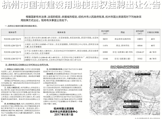 六、本次挂牌出让详细资料请参阅挂牌出让文件。有关挂牌出让文件资料可自2017年6月16日后到杭州市国土资源局(市民中心C座706室)或杭州市公共资源交易中心(杭州市江干区备塘路333号(原88号)一号楼1楼4号窗口)索取。