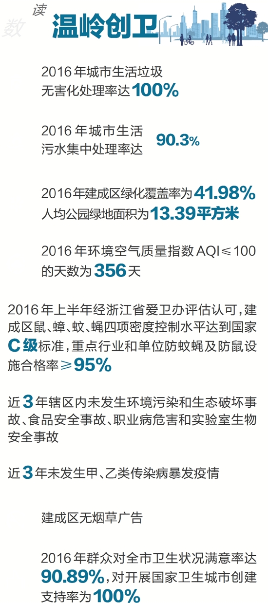 2016年上半年经浙江省爱卫办评估认可,建成区鼠、蟑、蚊、蝇四项密度控制水平达到国家C级标准,重点行业和单位防蚊蝇及防鼠设施合格率≥95%
