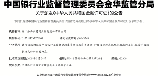 下列机构经中国银行业监督管理委员会金华监管分局批准,颁发《中华人民共和国金融许可证》,现予以公告。