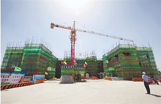 杭州市对口援疆工程阿克苏市多浪街道第一幼儿园大楼主体封顶。 余敏 摄