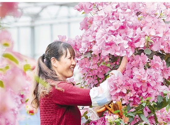 贵阳市开阳县布依族村民在护理三角梅。当地通过精准扶贫,让村民在家门口务工。 新华社发