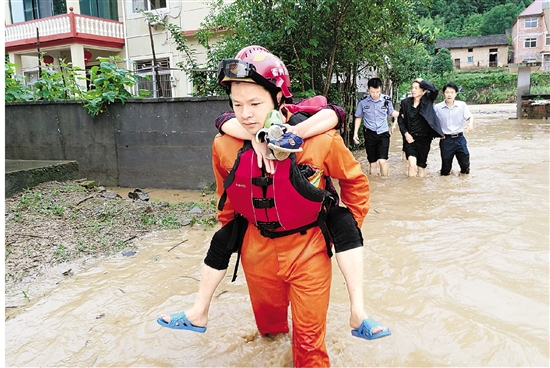 消防战士转移开化严村村受困村民。 拍友 杨鲁帅 摄