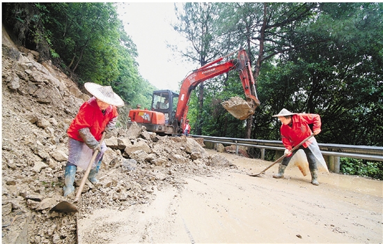 抢险队伍在永康山区公路清障排险。 拍友 林加强 朱旭宇 摄