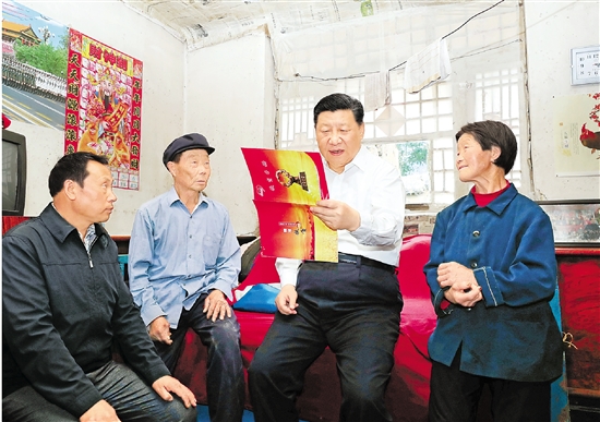 6月21日下午,习近平在忻州市岢岚县赵家洼村特困户刘福有家中察看扶贫手册。 新华社记者 庞兴雷 摄