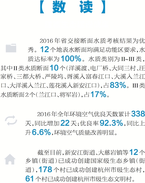 截至目前,新安江街道、大慈岩镇等12个乡镇(街道)已成功创建国家级生态乡镇(街道),178个村已成功创建杭州市级生态村,61个村已成功创建杭州市级生态文明村。