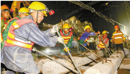 傍晚6时,抢险工作仍在进行之中,杭州工务段运来了枕木,抢险人员还准备去拉大石块和废旧钢铁,继续填补缺口,防止洪水进一步蔓延。