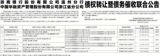 根据浙商银行股份有限公司温州分行与中国华融资产管理股份有限公司浙江省分公司签订的债权转让合同,浙商银行股份有限公司温州分行(所辖属各分支机构)已将其对公告清单中所列主体享有的债权(包括本金及相应利息和费用)转让给中国华融资产管理股份有限公司浙江省分公司,各债权对应的主合同以及担保合同项下的全部权利也依法转让给中国华融资产管理股份有限公司浙江省分公司。浙商银行股份有限公司温州分行(所辖属各分支机构)特公告通知借款人(主债务人)及担保人及其他相关当事人上述债权转让事实。
