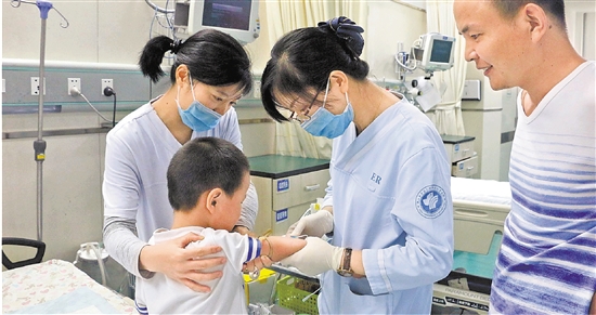 浙大儿院护士为小患者抽血。 本报记者 唐梦霞 摄