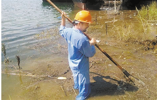 周丽明正在打捞湖面垃圾。 本报记者 刘健 摄