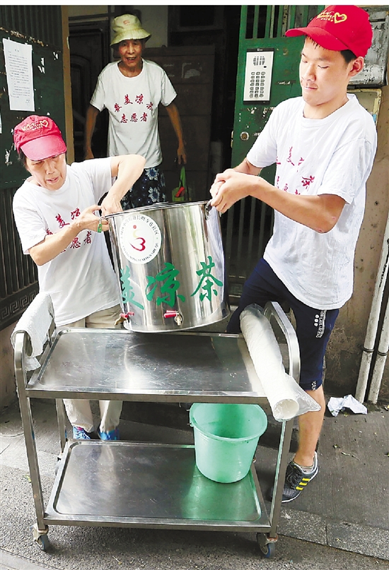 上午9点多,志愿者赶来帮助顾大伯摆凉茶摊。