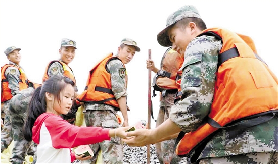 一位兰溪小朋友给抗洪的解放军叔叔送上解渴的西瓜。 陈拓 供图