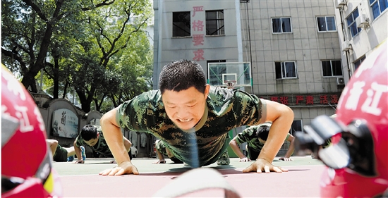 三伏天里,杭州消防大关中队的消防战士坚持每天训练,保证好的体能以便随时出警。 本报记者 王建龙 王嘉楠 张小斌 摄
