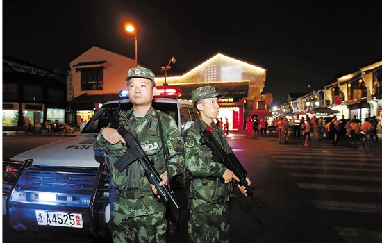 7月27日傍晚,武警杭州支队巡逻小分队在河坊街巡逻。这里游人如织,车水马龙,官兵们军姿挺拔,双目圆睁,警惕地巡视着每一个角落。 本报记者 胡元勇 拍友 陈志法 摄