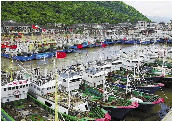 7月29日,苍南县舥艚港,回港避台风的渔船密密麻麻地停靠在港口。