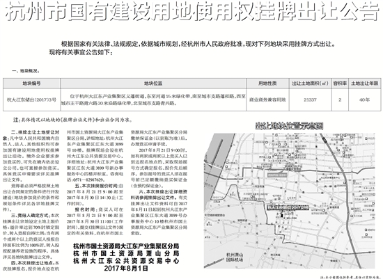 六、本次挂牌出让详细资料请参阅挂牌出让文件。有关挂牌出让文件资料可自2017年8月11日起到杭州大江东产业集聚区江东大道3899号办事服务中心10楼杭州市国土资源局大江东产业集聚区分局索取。