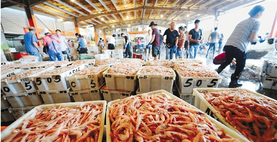渔民们正在温岭石塘镇钓浜海鲜交易市场交易第一网新鲜渔货。