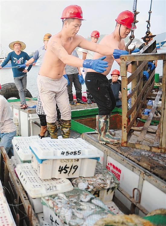 渔民们兴奋地将刚刚捕捞上来的渔货搬运上岸。