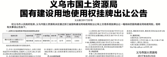 经义乌市人民政府批准,义乌市国土资源局决定通过浙江省国有建设用地使用权出让网上交易系统挂牌出让一幅地块的国有建设用地使用权。现将有关事项公告如下: