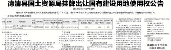 经德清县人民政府批准,德清县国土资源局决定于2017年10月31日15∶00在德清县公共资源交易中心公开挂牌出让一幅国有建设用地使用权。现将有关事项公告如下:
