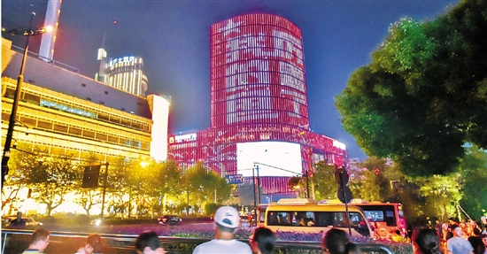 10月1日晚,杭州武林广场附近的国大城市广场大屏幕换上新装,以炫目的创意灯光秀献礼国庆,“厉害了我的国”等祝福字样跃然于上。